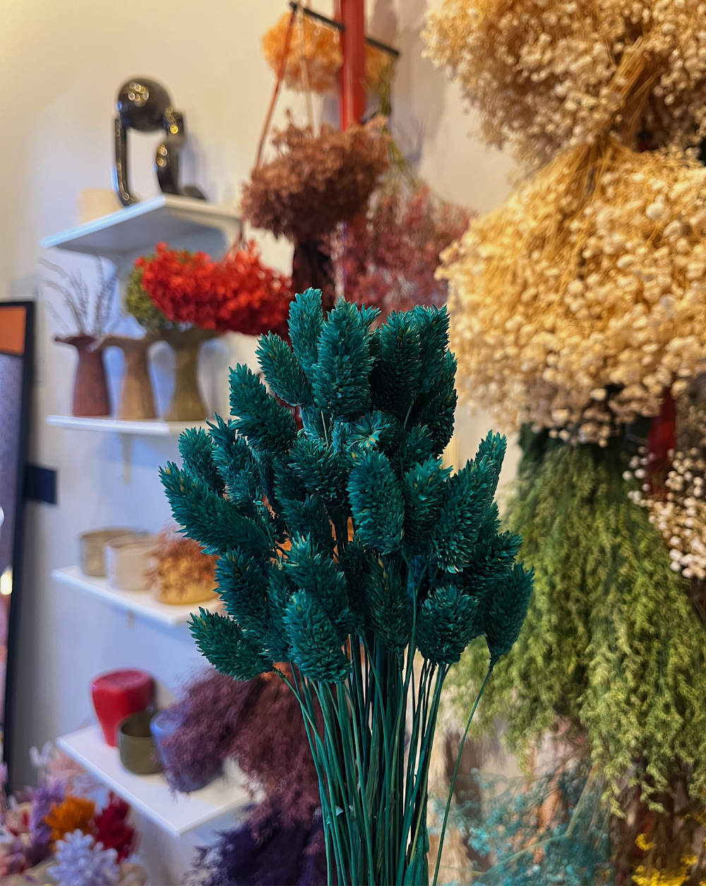 Bundle de phalaris en forma de piñas pequeñas, color azul turquesa.